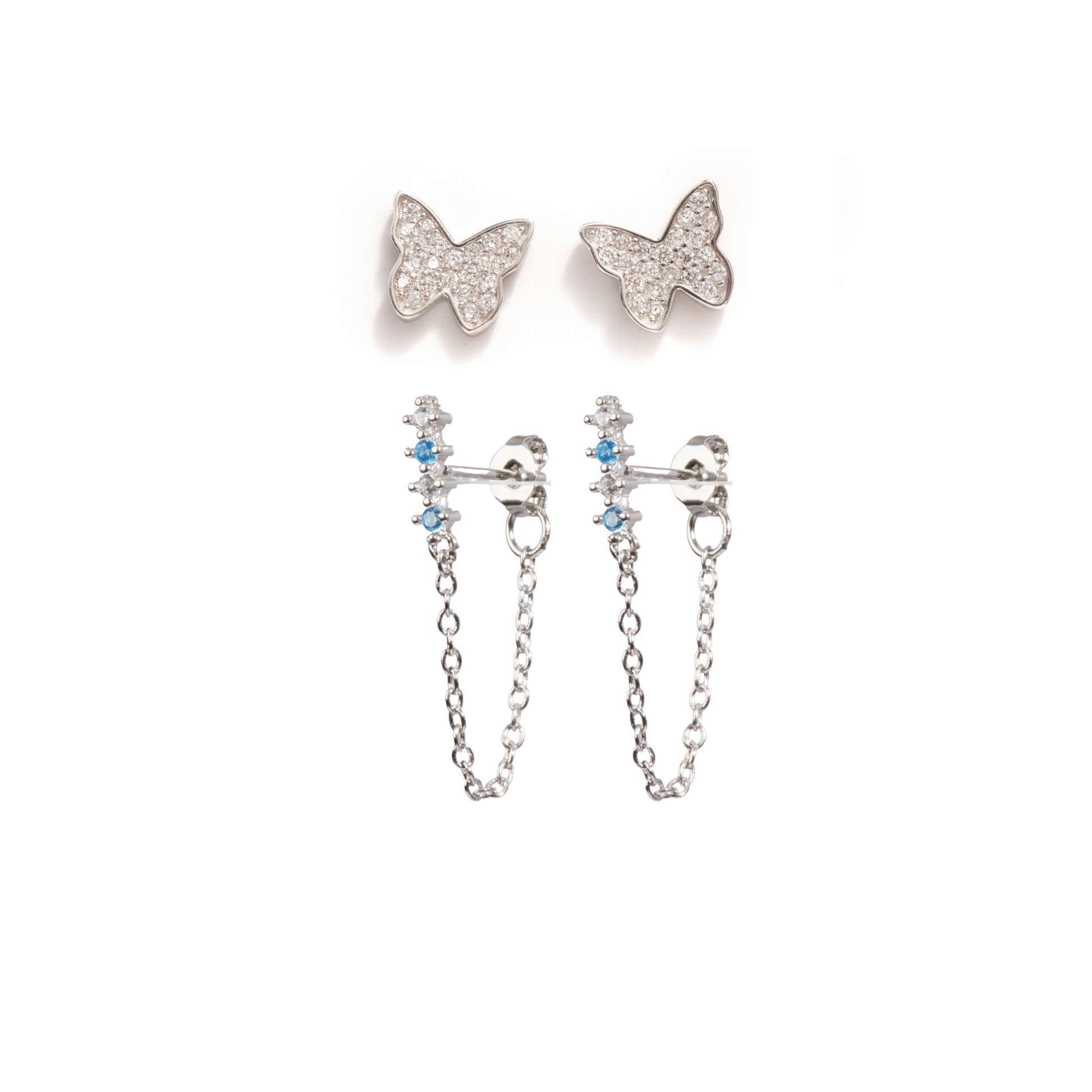 A dreamy blend of grace and sparkle, our Butterfly Elegance Earrings Set is designed for those who embrace beauty in transformation. This enchanting set features a stunning mix of butterfly studs and delicate chain earrings adorned with baby blue cubic zirconia, adding a soft, ethereal glow to your look.