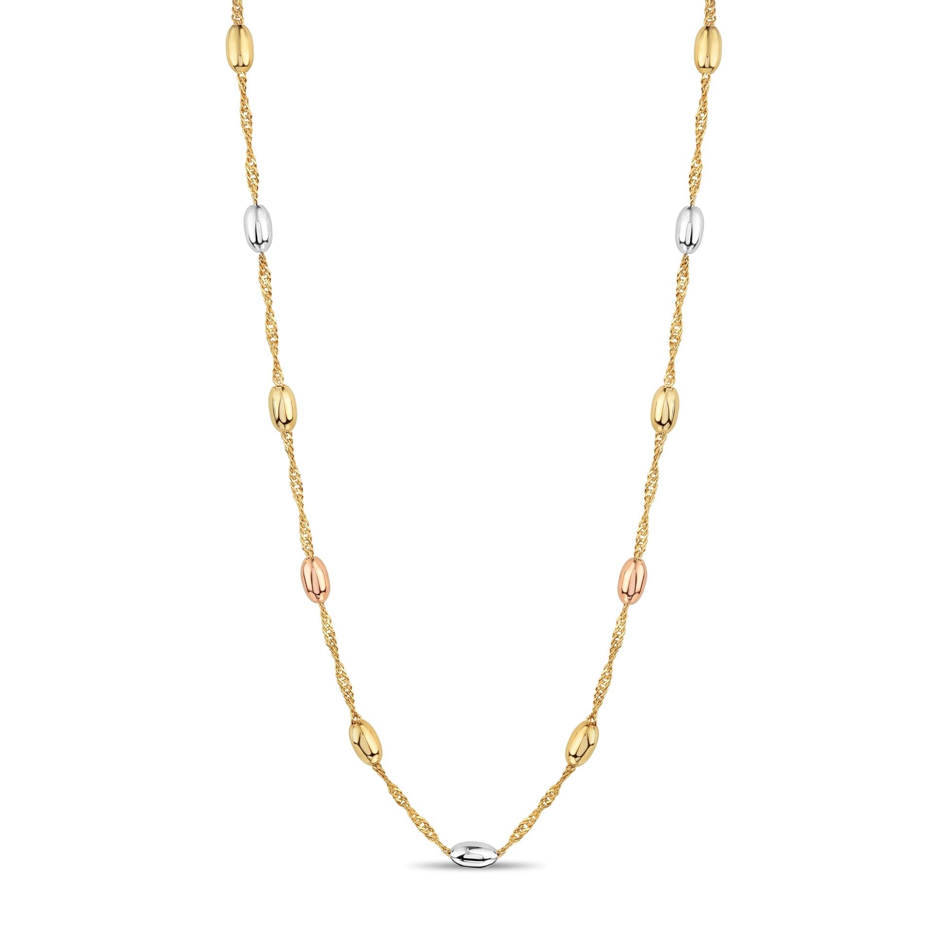 A tri-color bead necklace symbolizing the three phases of a woman’s life. The maiden ( rose), the mother ( gold) & the crone ( silver).